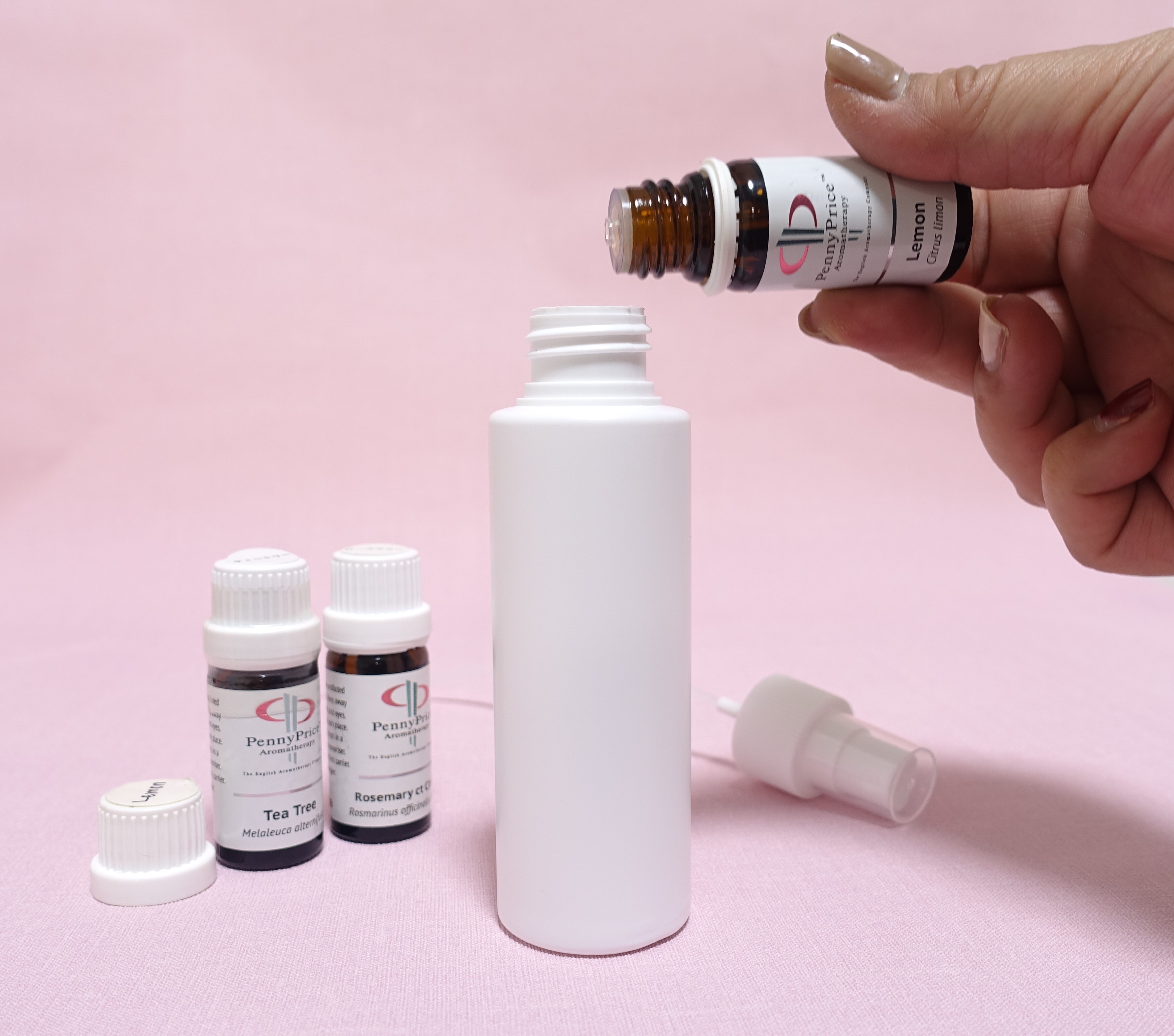 【アロマスプレーの作り方】①100mlのスプレー容器に20滴のアロマオイルを入れ、軽く混ぜる